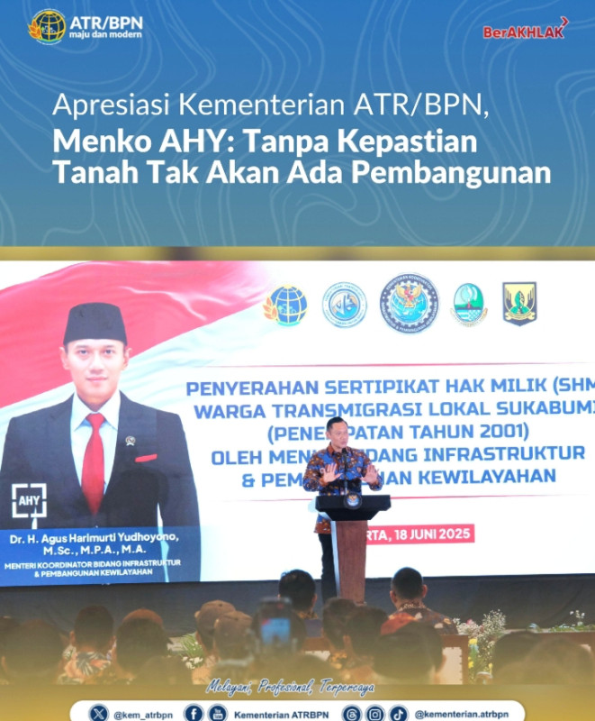 “Saya punya keyakinan bahwa Kementerian ATR/BPN memiliki peran yang sangat penting. Semua pembangunan, baik di Jawa maupun luar Jawa, selalu berawal dari satu hal, lahan. Kalau status lahan tidak jelas, tidak akan ada yang berani membangun. Bahkan investasi pun tidak akan datang,” ujar Menko AHY dalam acara penyerahan 1.120 Sertipikat Hak Milik (SHM) kepada transmigran asal Kabupaten Sukabumi, yang diselenggarakan di Kantor Kementerian Transmigrasi, Jakarta, Rabu (18/06/2025).