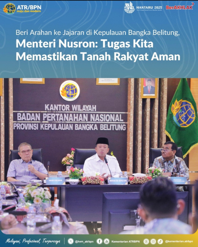 “Kita orang Kementerian ATR/BPN tugasnya memastikan bahwa tanah rakyat itu aman. Karena, kita masuk kategori _land tenure,_ yang berarti legalisasi aset. Aset itu harus dilegalisasi dan itu tugas kita,” ujar Menteri Nusron di Ruang Rapat Kanwil BPN Provinsi Kepulauan Bangka Belitung.