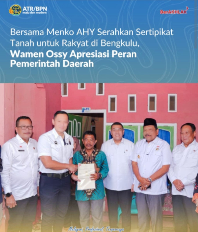 Bersama Menko AHY Serahkan Sertipikat Tanah untuk Rakyat di Bengkulu, Wamen Ossy Apresiasi Peran Pemerintah Daerah