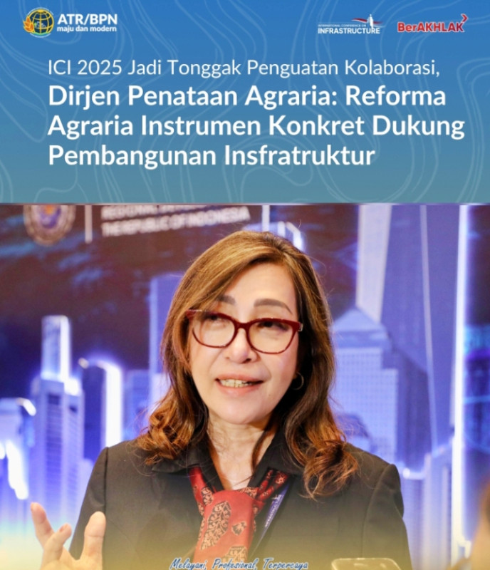 Jakarta, detikposkalimantan.com– International Conference on Infrastructure (ICI) 2025 dinilai menjadi tonggak penting penguatan kolaborasi pembangunan infrastruktur nasional. Direktur Jenderal Penataan Agraria Kementerian Agraria dan Tata Ruang/Badan Pertanahan Nasional (ATR/BPN), Yulia Jaya Nirmawati, menegaskan bahwa Reforma Agraria memiliki peran nyata sebagai instrumen konkret untuk mempercepat pengembangan infrastruktur yang adil dan inklusif.