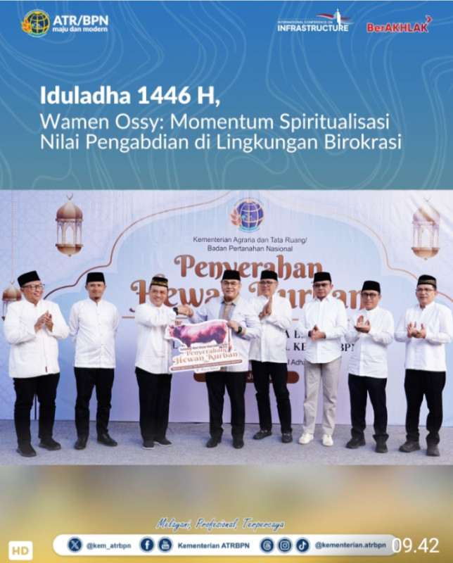Kegiatan tahun ini mengangkat tema “Tingkatkan Kepedulian Berbagi Bersama Qurban ATR/BPN” sebagai cerminan semangat gotong royong, kepedulian, dan pelayanan tulus kepada masyarakat yang menjadi landasan utama pengabdian Kementerian ATR/BPN. Dalam kesempatan ini, dilakukan penyerahan simbolis hewan kurban dari Wamen ATR/Waka BPN kepada Ketua DKM Masjid Nururrahman. Turut hadir, sejumlah Pejabat Pimpinan Tinggi Madya dan Pratama Kementerian ATR/BPN. Kegiatan ini juga diikuti secara daring oleh shohibul qurban. (LS/YZ)