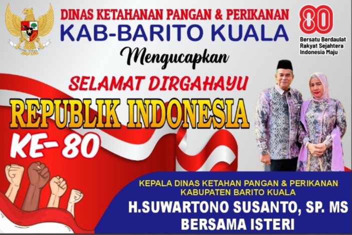 KEPALA DINAS KETAHANAN PANGAN & PERIKANAN KAB-BARITO KUALA BESERTA ISTRI & SELURUH STAF MENGUCAPKAN SELAMAT DIRGAHAYU REPUBLIK INDONESIA KE-80