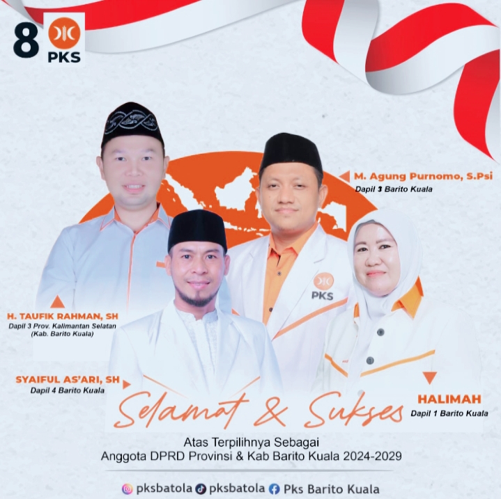 M Agung Purnomo selaku Ketua Umum Dewan Pimpinan Daerah Partai Keadilan Sejahtera (DPD PKS) Kabupaten Barito Kuala (Batola), Provinsi Kalimantan Selatan (Kalsel) Mengucapkan Selamat dan Sukses atas terpilihnya sebagai Anggota DPRD Provinsi Kalsel dan Kabupaten Batola 2024 – 2029, yakni