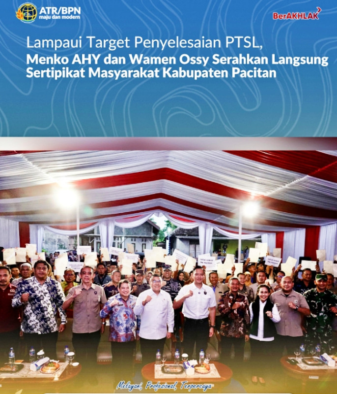 Lampaui Target Penyelesaian PTSL, Menko AHY dan Wamen Ossy Serahkan Langsung Sertipikat Masyarakat Kabupaten Pacitan