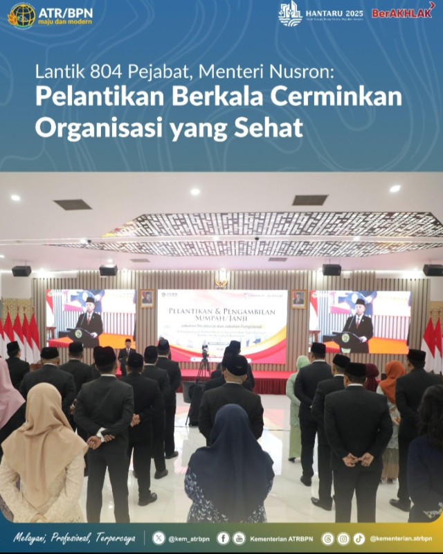Jakarta, detikpoakalimantan.com – Menteri Agraria dan Tata Ruang/Kepala Badan Pertanahan Nasional (ATR/BPN), Nusron Wahid, melantik 804 pejabat di lingkungan Kementerian ATR/BPN pada Rabu (08/10/2025). Dalam sambutannya, Menteri Nusron menyebut pelantikan yang dilakukan secara berkala menandakan roda organisasi Kementerian ATR/BPN berjalan dengan baik.