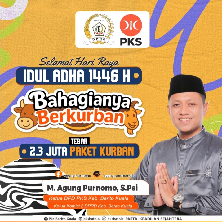 M. Agung Purnomo, S.Psi Ketua DPD PKS Kabupaten Barito Kuala (Batola) dan juga sebagai Ketua Komisi 2 DPRD Batola Mengucapkan Selamat Hari Raya Idul Adha 1446 H