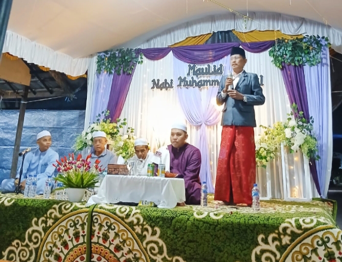 Zainul Aqli selaku Kepala Desa Sungai Lakum, Kecamatan Kertak Hanyar, Kabupaten Banjar, Provinsi Kalimantan Selatan saat memberikan kata sambutan pada acara Maulid Nabi Muhammad SAW