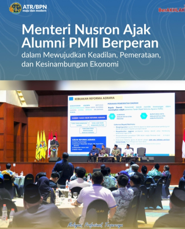 Ia mengungkapkan, dari total 55,9 juta hektare tanah yang telah terpetakan dan bersertipikat, saat ini terdapat 1,4 juta hektare tanah telantar yang tercatat sebagai Tanah Objek Reforma Agraria (TORA). Tanah tersebut dapat dimanfaatkan oleh siapapun yang memiliki kepentingan untuk masyarakat, termasuk alumni PMII, baik untuk kepentingan pendidikan maupun pemberdayaan ekonomi umat. “Prinsipnya kami terbuka, sekarang ini ada potensi luar biasa berupa tanah. Daripada tidak dimanfaatkan, ayo kita manfaatkan,” tutur Menteri Nusron.