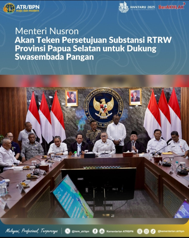 “Hari ini kita rapat lintas sektoral dalam pembahasan konsep persetujuan RTRW Provinsi Papua Selatan. Insyaallah dalam waktu 1-2 hari mendatang, Persetujuan Substansi RTRW Provinsi Papua Selatan akan kami teken persetujuannya,” kata Menteri Nusron usai menghadiri Rapat Koordinasi Terbatas Tingkat Menteri Lintas Sektor di Kantor Kementerian Koordinator Bidang Pangan, Jakarta, Rabu (01/10/2025).