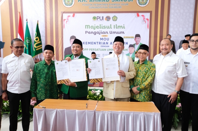 Kota Sukabumi, detikposkalimantan.com – Menteri Agraria dan Tata Ruang/Kepala Badan Pertanahan Nasional (ATR/BPN), Nusron Wahid, menandatangani Nota Kesepahaman (MoU) yang meresmikan kerja sama dengan Dewan Pimpinan Pusat (DPP) Persatuan Ummat Islam (PUI), di Pondok Pesantren Syamsul ‘Ulum, Kota Sukabumi, Rabu (16/04/2025). Dalam sambutannya, Menteri Nusron menekankan pentingnya pemanfaatan tanah secara produktif untuk kemakmuran rakyat, termasuk tanah-tanah wakaf.