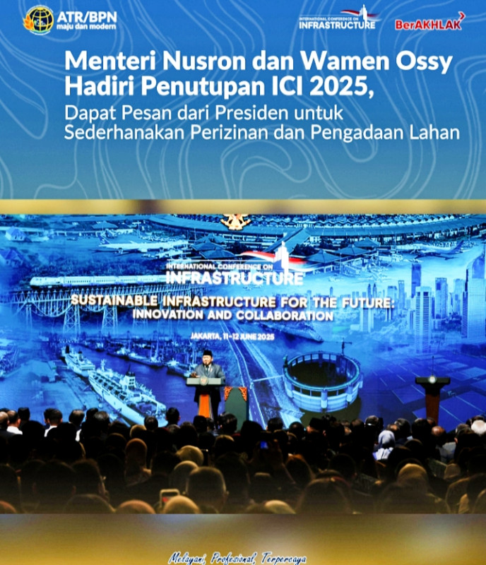 Jakarta, detikposkalimantan.com- Menteri Agraria dan Tata Ruang/Kepala Badan Pertanahan Nasional (ATR/BPN), Nusron Wahid, didampingi Wakil Menteri (Wamen) ATR/Wakil Kepala (Waka) BPN, Ossy Dermawan, hadir dalam Penutupan International Conference on Infrastructure (ICI) 2025 pada Kamis (12/06/2025). Acara yang berlangsung di Jakarta International Convention Center (JICC) ini dibuka langsung oleh Presiden Republik Indonesia, Prabowo Subianto.