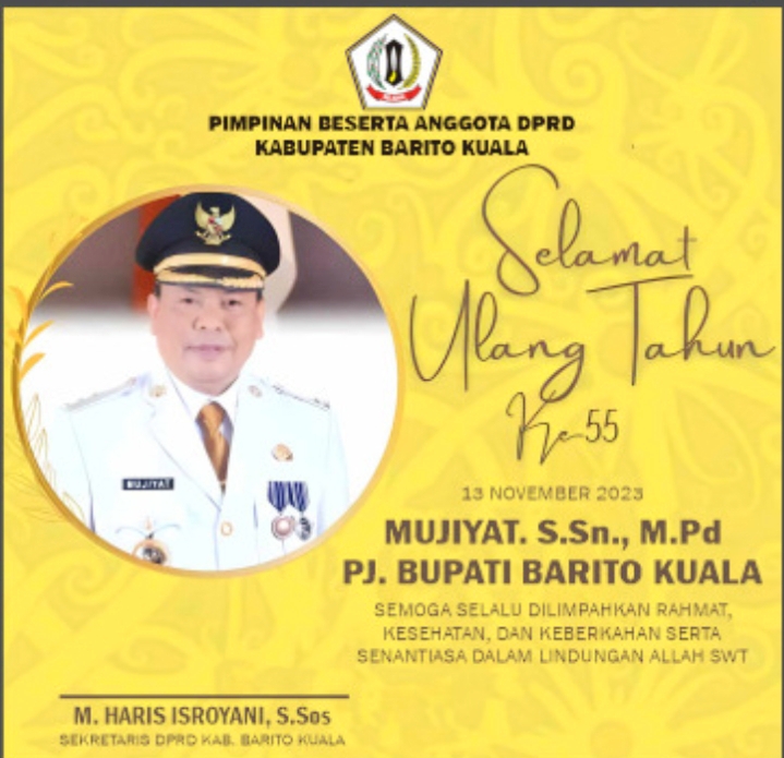 Pimpinan Beserta Anggota DPRD Batola Ucapkan Selamat Ulang Tahun ke 55 Tahun kepada Pj Bupati Batola, Mujiyat, S.Sn, M.Pd detikpo1 | 17 November 2023, 11:11 am | 0 comments | 52 views Selamat Ulang Tahun ke 55 Tahun kepada Bapak Mujiyat selaku Pj Bupati Barito Kuala. Semoga Allah SWT selalu memberikan kesehatan, dan Amanah dalam memajukan Kabupaten Barito Kuala lebih maju lagi.