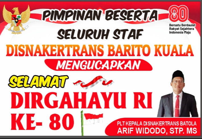 PIMPINAN BESERTA SELURUH STAF DISNAKERTRANS KAB – BARITO KUALA MENGUCAPKAN SELAMAT DIRGAHAYU REPUBLIK INDONESIA KE 80