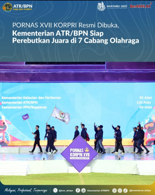 Palembang, detikposkalimantan.com – Pekan Olahraga Nasional (PORNAS) Korps Pegawai Republik Indonesia (KORPRI) yang ke-XVII resmi dibuka oleh Wakil Menteri Pendayagunaan Aparatur Negara dan Reformasi Birokrasi, Purwadi Arianto, dalam _Opening Ceremony_ yang digelar di Jakabaring Sport City, Palembang, Sumatra Selatan, Minggu (05/10/2025). Kementerian Agraria dan Tata Ruang/Badan Pertanahan Nasional (ATR/BPN) siap memperebutkan juara di tujuh cabang olahraga (cabor) yang diikuti.