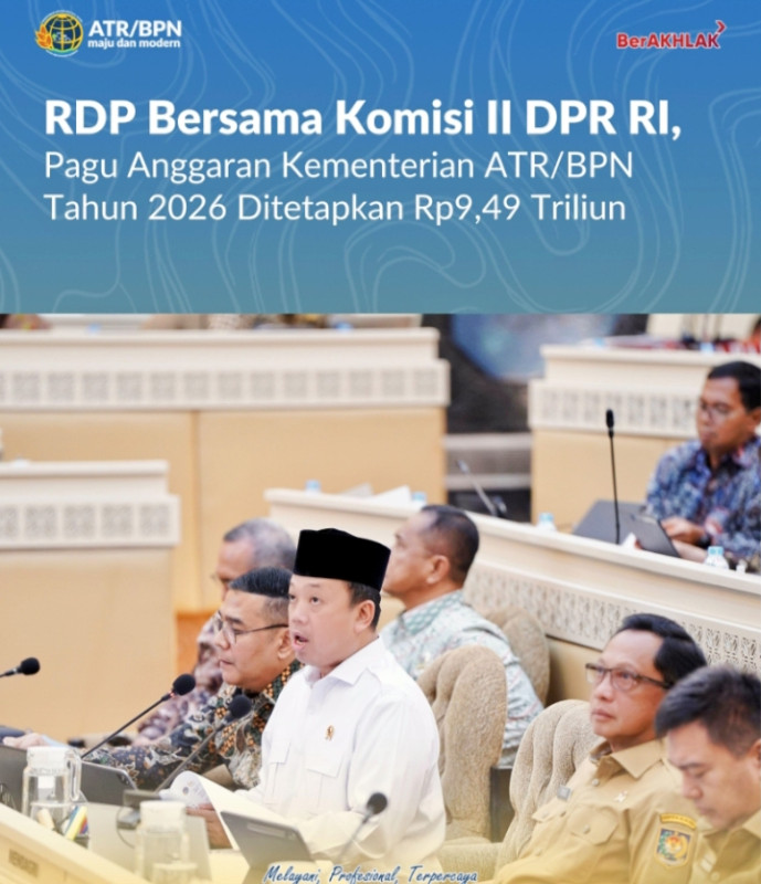 RDP Bersama Komisi II DPR RI, Pagu Anggaran Kementerian ATR/BPN Tahun 2026 Ditetapkan Rp9,49 Triliun