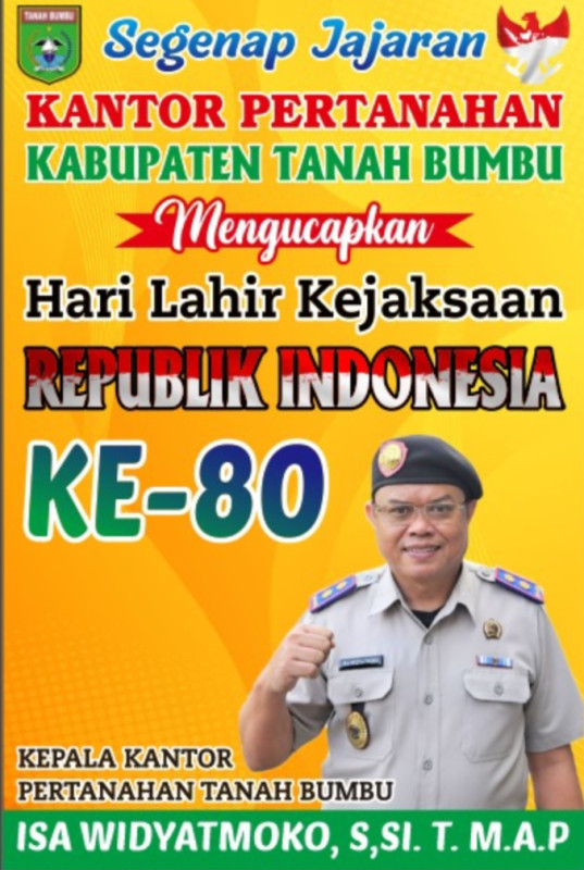 Segenap Jajaran Kantor Pertanahan Kabupaten Tanah Bumbu Mengucapkan Selamat Hari Lahir Kejaksaan RI ke-80 tahun 2025 detikpo1 | 02 September 2025, 09:09 am | 0 comments | 22 views Maju dan jaya selalu untuk Kejaksaan RI, garda terdepan penegak bangsa kita. “Transformasi Kejaksaan Menuju Indonesia Maju” “Semoga kejaksaan senantiasa menegakkan hukum dengan keadilan sebagai suluh bagi bangsa”