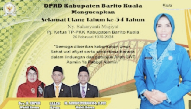 Pimpinan DPRD Kabupaten Barito Kuala (Batola) beserta Anggota Mengucapkan Selamat Ulang Tahun ke 54 Tahun pada 26 Februari 2024 kepada Ibu Pj Ketua PKK Batola Suharyanti Mujiyat