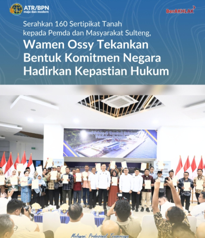 Serahkan 160 Sertipikat Tanah kepada Pemda dan Masyarakat Sulteng, Wamen Ossy Tekankan Bentuk Komitmen Negara Hadirkan Kepastian Hukum