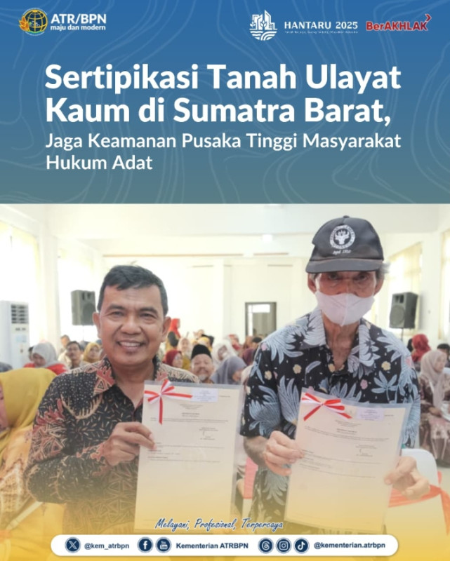 Di tengah tantangan modernisasi saat ini, Pemerintah Republik Indonesia berupaya memenuhi kepastian hukum hak atas tanah bagi masyarakat hukum adat melalui sertipikasi tanah. Seperti cerita dari dua penerima Sertipikat Hak Milik dalam kegiatan Penyerahan Sertipikat Tanah untuk Rakyat, Kerapatan Adat Nagari (KAN) Kuranji, Kota Padang, Selasa (30/09/2025).