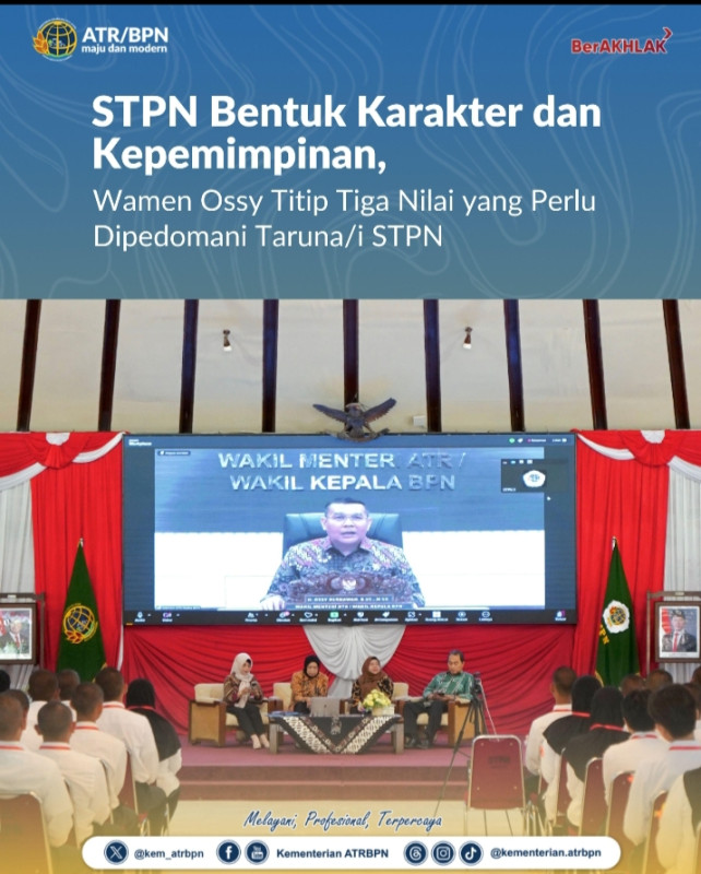 Saat berkecimpung di dunia pertanahan dan tata ruang, Wamen Ossy mengingatkan agar Taruna/i STPN untuk terus memegang prinsip dalam bekerja. Nantinya, pekerjaan para penerus insan pertanahan dan tata ruang ini bukan hanya membagikan sertipikat semata. Taruna/i diminta untuk memastikan dan berpegang teguh pada prinsip integritas dan karakter yang kuat dalam melayani masyarakat.