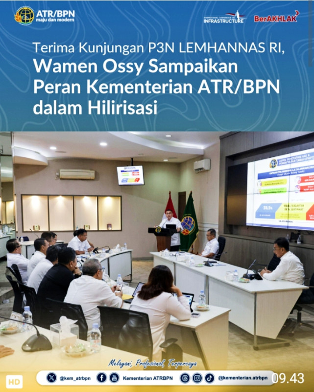 “Kementerian ATR/BPN ini bukan hanya kita mengawal legislasi ataupun kepastian hukum dari tanah dan ruang, kita juga harus memastikan keadilan agraria serta penataan ruang nasional yang semuanya adalah pondasi utama bagi proses hilirisasi di negara kita,” ujar Ossy Dermawan saat menerima para peserta P3N di Aula PTSL Kementerian ATR/BPN, Jakarta.