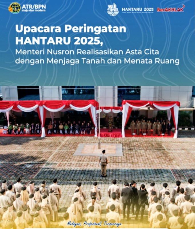 “Kebijakan agraria dan tata ruang hanya akan bermakna bila benar-benar menghadirkan manfaat bagi masyarakat. Inilah cara kita mewujudkan Asta Cita, dengan memastikan tanah terjaga dan ruang tertata sehingga manfaatnya bisa dirasakan rakyat hari ini dan di masa mendatang,” ujar Menteri ATR/Kepala BPN, Nusron Wahid, yang dalam Upacara Peringatan HANTARU 2025 bertindak sebagai inspektur upacara.