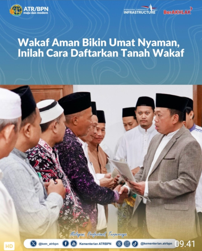 Kementerian ATR/BPN berkomitmen untuk terus meningkatkan pelayanan publik secara transparan dan akuntabel. Kepastian hukum hak atas tanah, termasuk tanah wakaf, merupakan bagian dari pelayanan yang Kementerian ATR/BPN prioritaskan demi mendukung kehidupan sosial keagamaan masyarakat Indonesia.